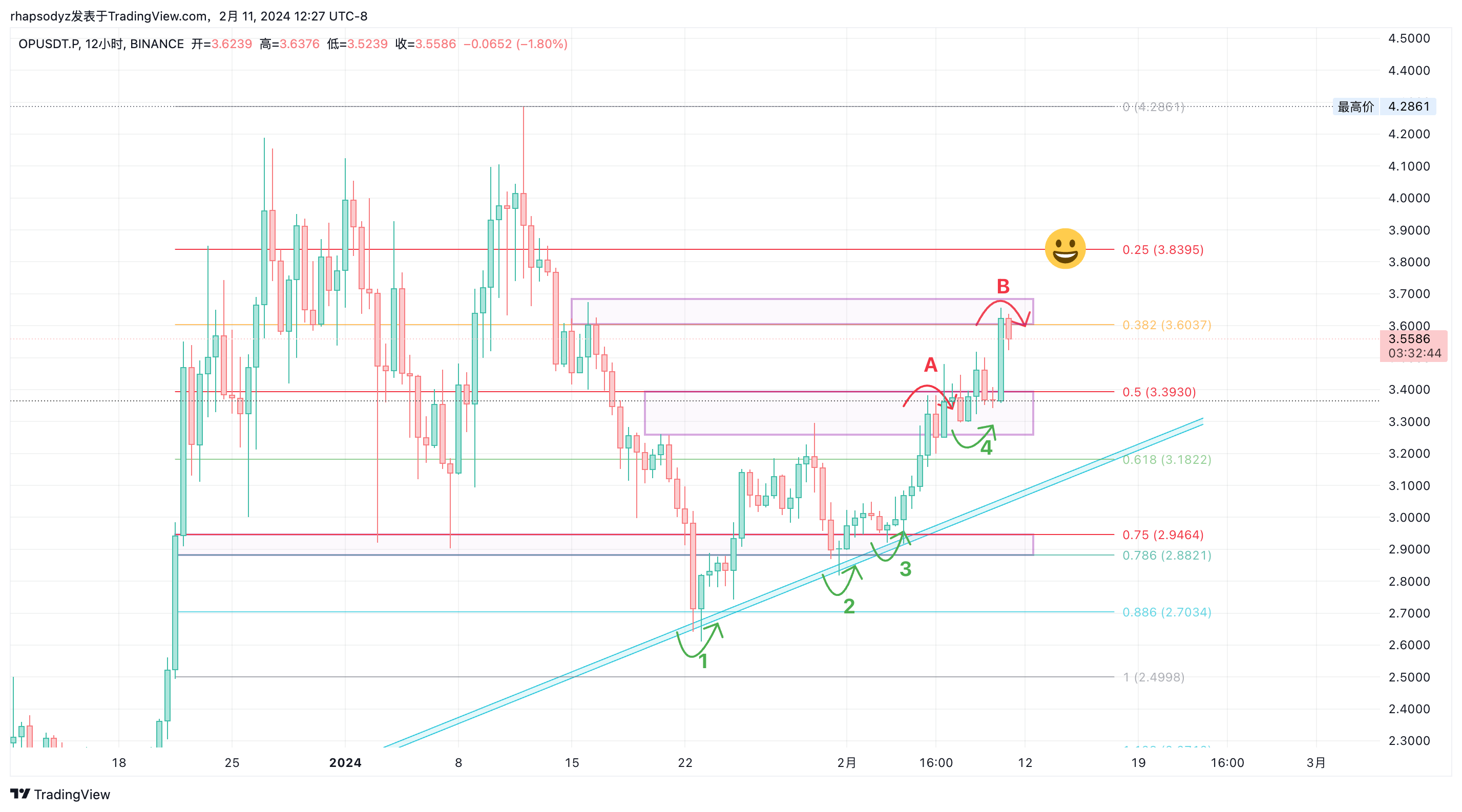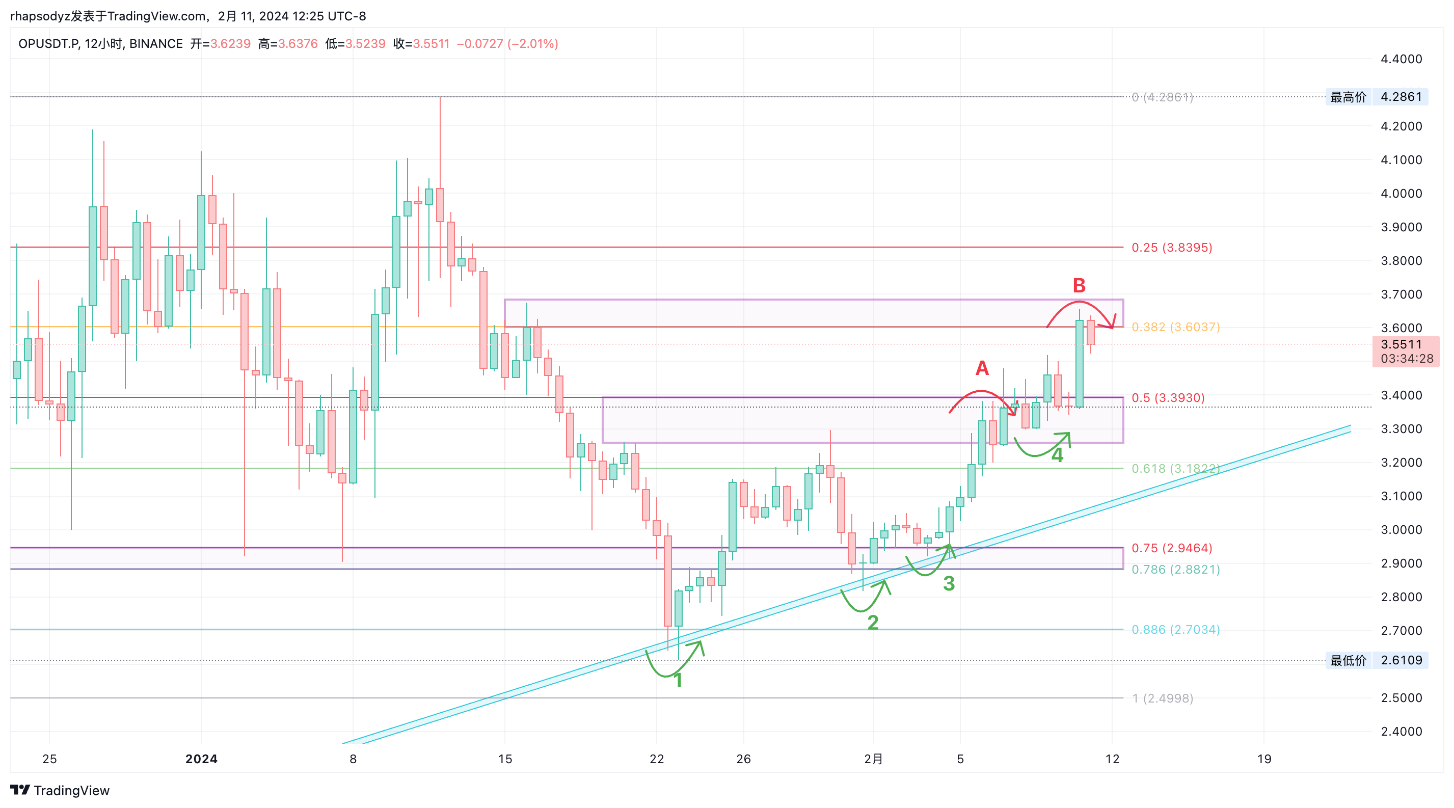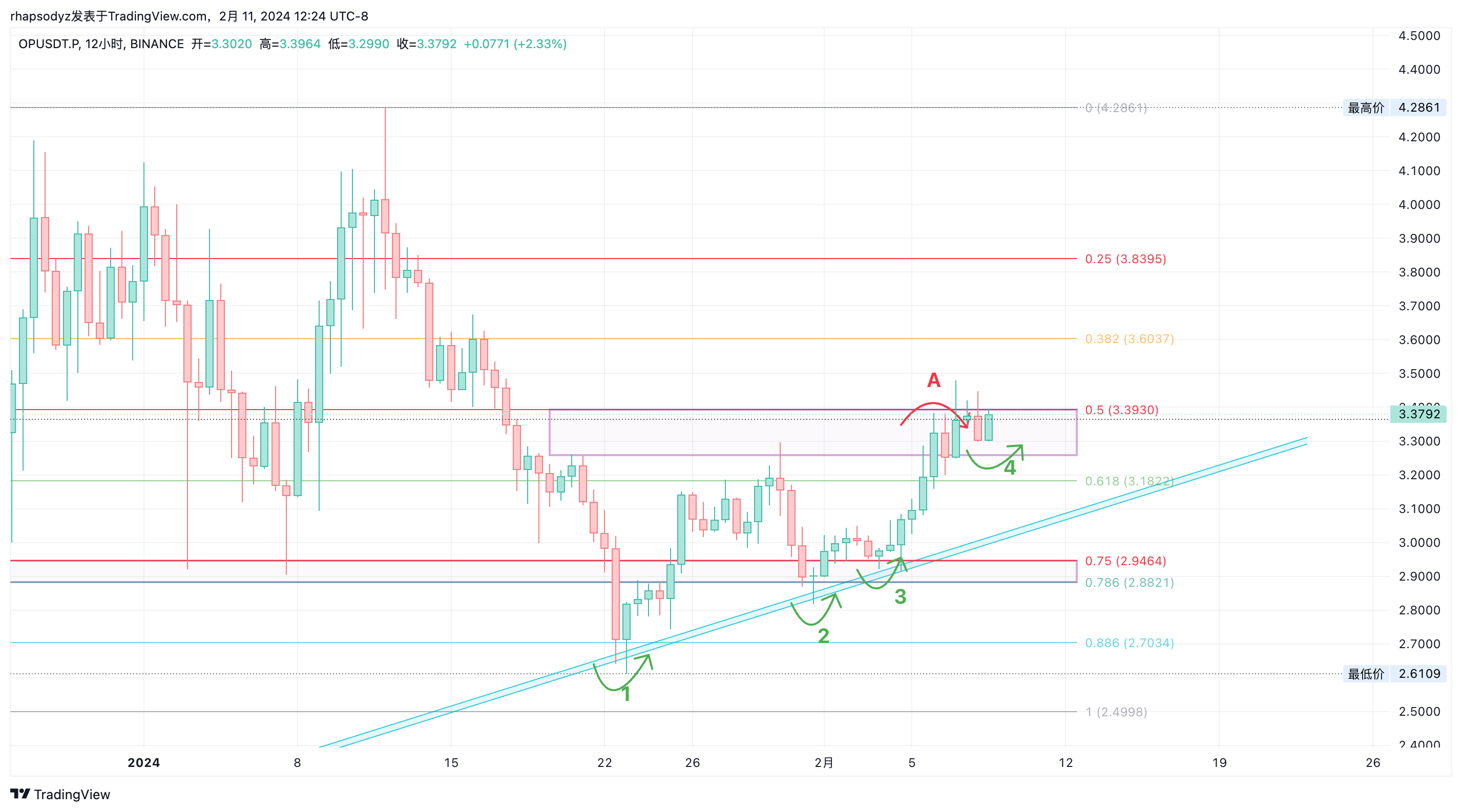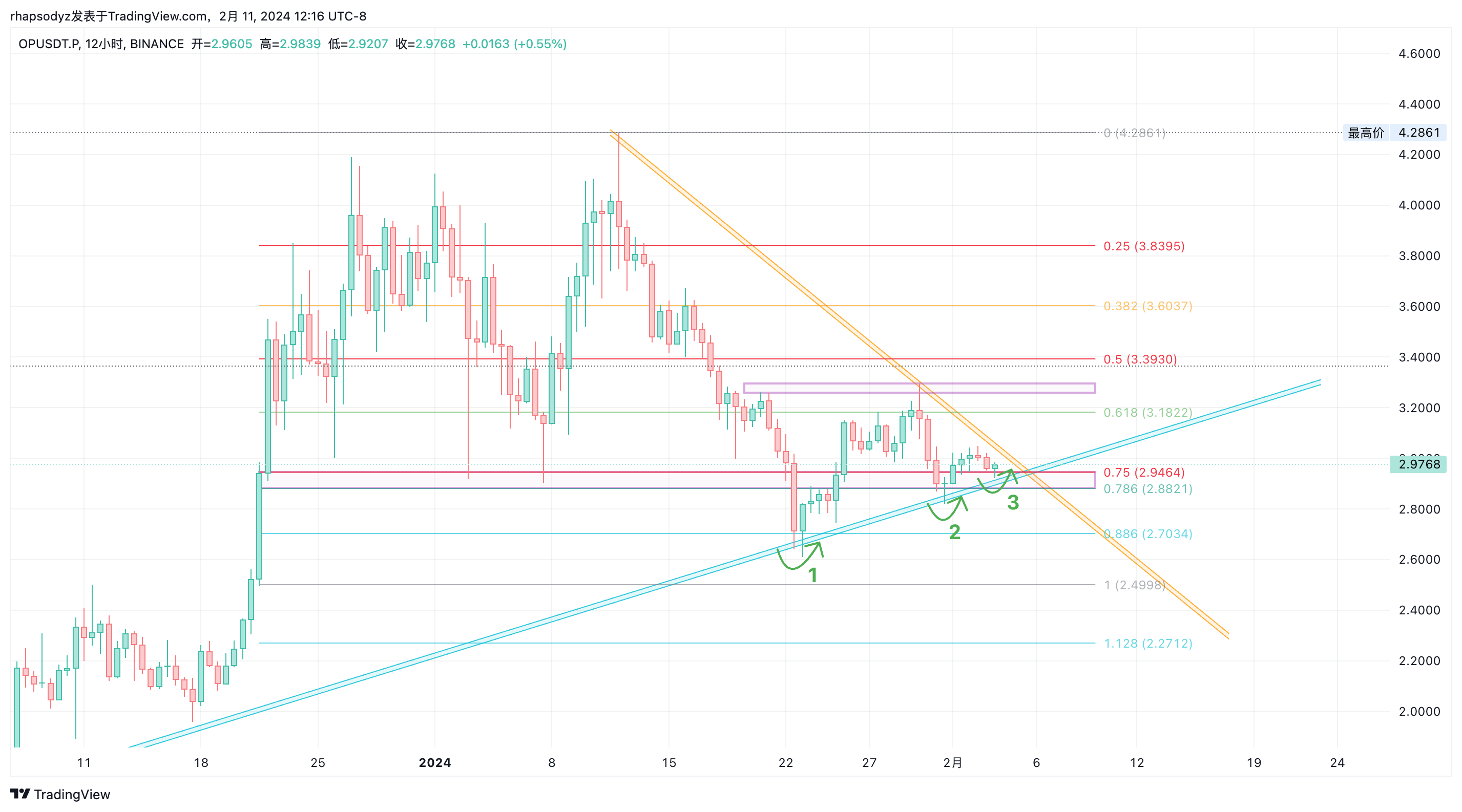 这里主要是讲一个比较简单的,依托斐波那契配合量价形态关键区间底部抓反弹的策略,拿近期比较典型的 $OP 来讲一讲。